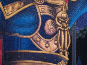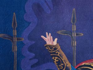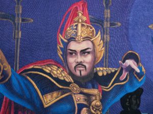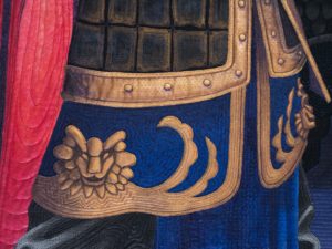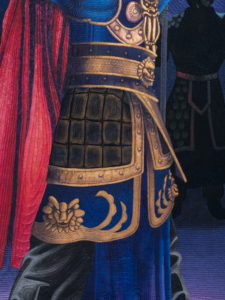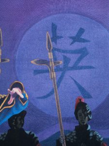 On a trip to China, we witnessed a stunning Tang Dynasty performance of music and dance. This warrior presented such a powerful presence of command and leadership, I knew I wanted to tell his story of courage, which is the symbol in the background.