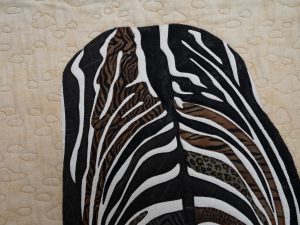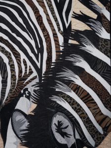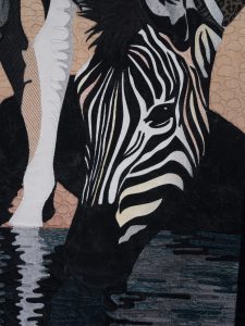Being vulnerable in the wild at the waters edge, these elegant animals risk life to quench their thirst. Using hand painted fabrics of the animals that are their predators as the dark stripes, we subtlely see their ongoing precariousness as they roam the grasslands.