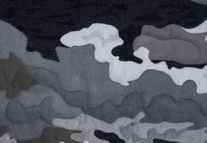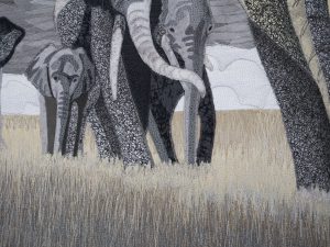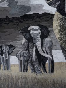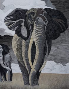 The sense of perspective and creating depth in images has always been important to me in telling stories. This trail of elephants does that so well. Add to that the power of strong graphic shapes with high value contrast, such as the imposing clouds to catch the viewer’s eye, and I was compelled to create this art quilt.