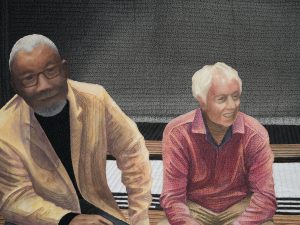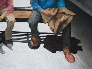 This is the image of support and loyalty of 3 husbands whose wives have art work in an exhibit on opening night. After a few hours of being social and caring, they found an alcove to sit and wait for the event to close while they watch their wives being in the spotlight. They were in a different spotlight in the photograph taken.